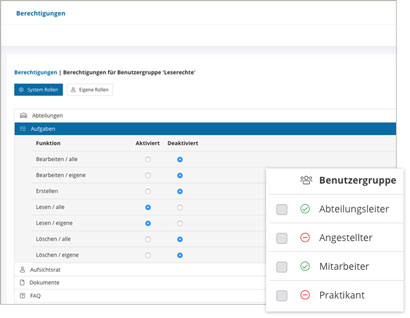 In der Oberfläche der Benutzergruppen und Rechte verwaltet der Admin ohne Programmierkenntnisse die Grundeinstellungen in der IntranetBOX. Egal ob ein Unternehmen in verschiedene Standorte oder Firmen unterteilt ist, der Admin kann individuell jeden Mitarbeiter mit Zugriffsrechten ausstatten. Sind einmal die Grundstrukturen der Gruppen und Rechte eingerichtet, erleichtert das Rechtemanagement das tägliche Arbeiten in der IntranetBOX. In vielen Unternehmen sind die Mitarbeiterdaten über das vorhandene Active Directory (AD) geregelt. Das AD im Unternehmen kann an die IntranetBOX übergeben werden. Die IntranetBOX sorgt dann für eine feinere Graduierung der Benutzerrechte.