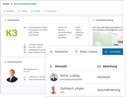 Unter Kontakte personalisieren Sie die Verknüpfungen zu Ihren Kundendaten. In der Kontakte-Auflistung von A-Z listen Sie die Mitarbeiter in Firmen, Abteilung, Entscheider, Telefon, Email, PLZ, Ort und Land auf. Unterstützt werden Sie auch hier von der mächtigen Suche.