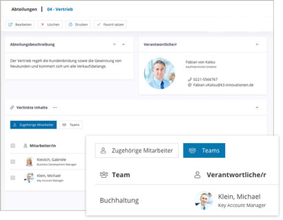 In Teams unterteilen Sie die Grundstruktur Ihres Unternehmens in kleinere Gruppen. Jedes Team hat einen Verantwortlichen. Die Unterteilung der Grundstruktur ist an jedes Unternehmen flexibel anpassbar. In der Übersicht erhalten Sie schnell die Information, welche Teams welcher Abteilung zugeordnet sind und wie viele Mitglieder oder auch Aufgaben den Teams zugeordnet sind. In jedem Team können Sie Details und Verknüpfungen zu Mitarbeitern, Projekten, Daten usw. erstellen.